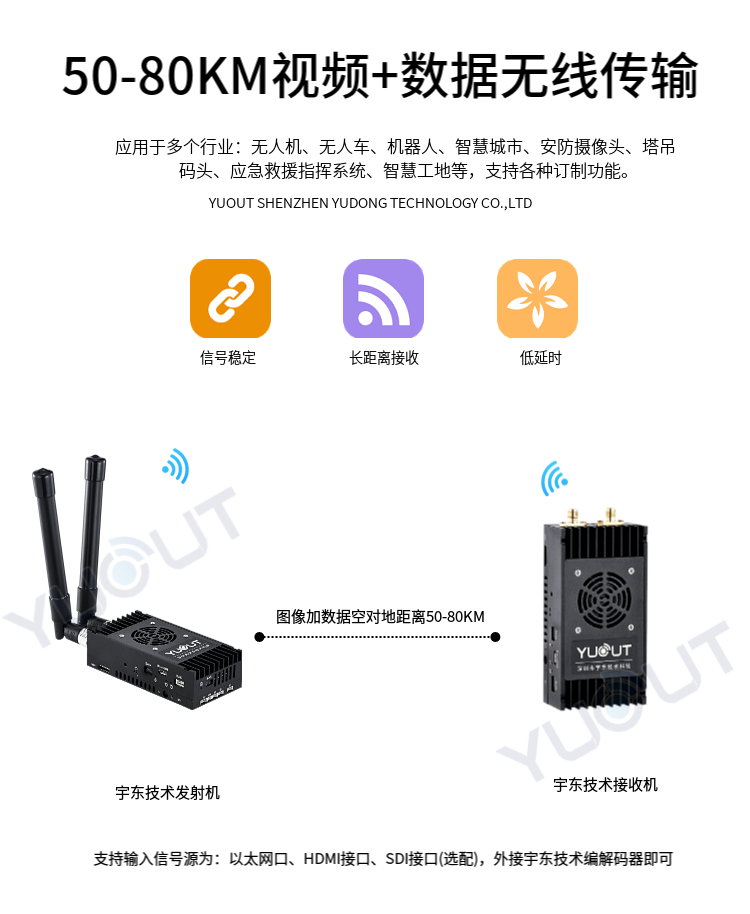 YD-TS0080-WK  是應用于無人機行業的圖數控一體化超遠距離無線傳輸設備(最遠可達 50至80 公里),具有體積小、功耗低、通信距離遠等特點,支持高清視頻、飛控數據、云臺控制數據、遙控器控制數據等同時傳輸。