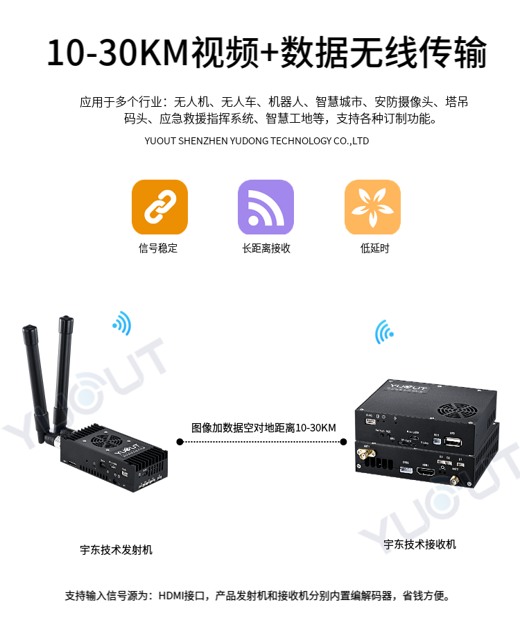 YD-HDT530-DM是應(yīng)用于無人機(jī)行業(yè)的圖數(shù)控一體化超遠(yuǎn)距離無線傳輸設(shè)備(最遠(yuǎn)可達(dá) 15至30 公里),具有體積小、功耗低、通信距離遠(yuǎn)等特點(diǎn),支持高清視頻、飛控?cái)?shù)據(jù)、云臺(tái)控制數(shù)據(jù)、遙控器控制數(shù)據(jù)等同時(shí)傳輸。