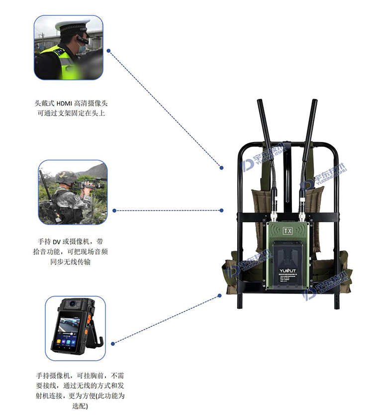 宇東技術雷神2號plus-X4一拖四背負式高清無線圖傳電臺,是應對突發事故,斷網斷電,如地震、洪災、反恐、應急救援、部隊演習等使用通信,本設備由4路背負式單兵發射機電臺和1臺四路接收于一體的接收電臺地面指揮箱組成,指揮箱自帶四路接收模組和顯示器及功能按鍵,可同時接收四路發射機的視頻和對講信號數據,指揮箱自帶揚聲器,可接收DV無線發送現場的聲音數據。支持擴展HDMI外接顯示大屏及插USB錄像保存功能,真正義意上做到及時取證,錄像保存,移動通信,統計指揮調度等。