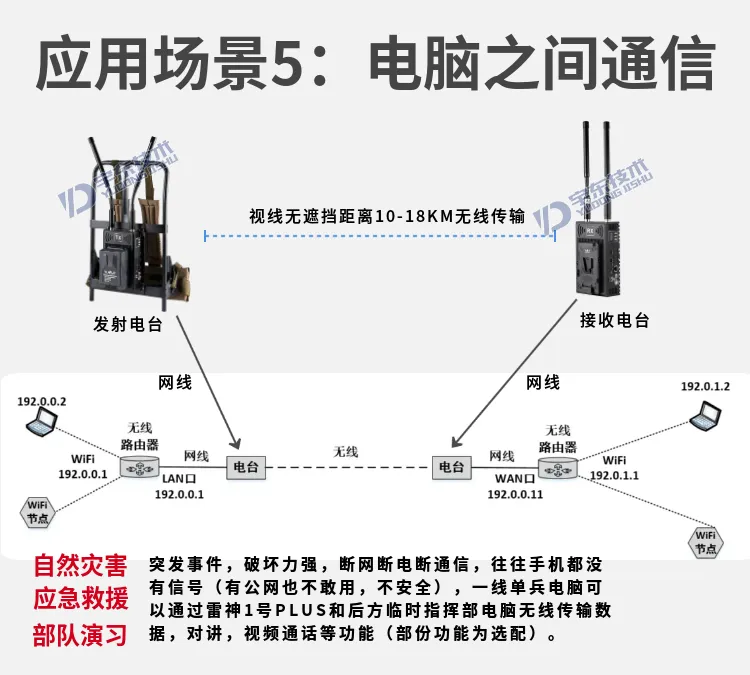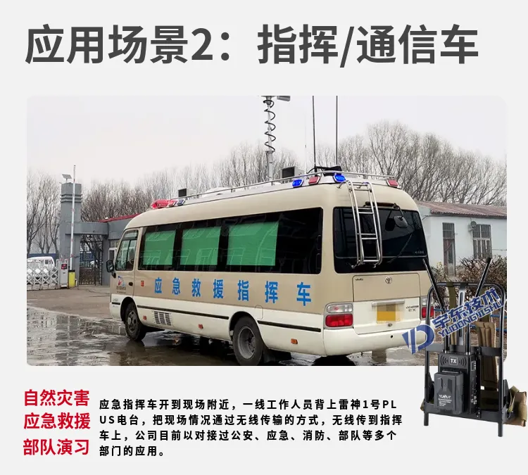 宇東技術雷神1號PLUS背負式高清無線圖傳電臺,是公司針對應急救援指揮、公安、反恐作戰、消防救援、邊防執勤、海警海關巡檢、部隊拉練演習、森林消防等,在突發重大事件,斷網斷電,通信中斷的情況下,現場工作人員通過宇東雷神1號PLUS單兵圖傳電臺,把現場采集的數據實時無線傳輸到指揮車/臨時指揮部大屏幕,讓指揮部領導對現場情況一目了然,節省了到達現場的時間,可快速做緊急指揮調度,最大限度的減少突發事件帶來的各種損失。