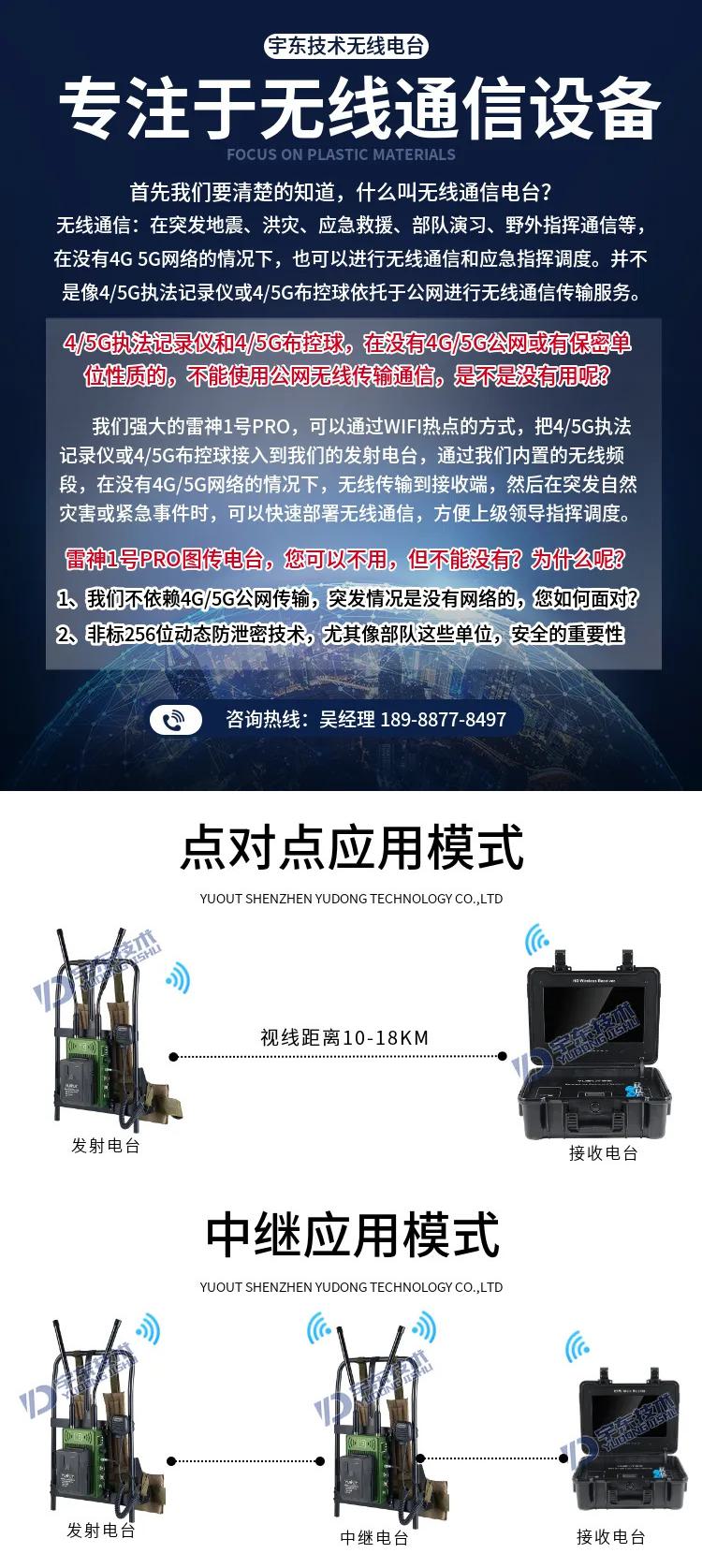 宇東技術(shù)雷神1號(hào)PRO背負(fù)式高清單兵無線圖傳電臺(tái),是公司針對(duì)應(yīng)急救援指揮、部隊(duì)拉練演習(xí)、公安、反恐作戰(zhàn)、消防救援、邊防執(zhí)勤、海警海關(guān)巡檢、森林消防等,在突發(fā)重大事件,斷網(wǎng)斷電,通信中斷的情況下,現(xiàn)場(chǎng)工作人員通過宇東雷神1號(hào)PRO單兵無線圖傳電臺(tái),可以和指揮部雙向語音通話對(duì)講,把現(xiàn)場(chǎng)采集的數(shù)據(jù)實(shí)時(shí)無線傳輸?shù)街笓]車/臨時(shí)指揮部大屏幕,讓指揮部領(lǐng)導(dǎo)對(duì)現(xiàn)場(chǎng)情況一目了然,節(jié)省了到達(dá)現(xiàn)場(chǎng)的時(shí)間,可快速做緊急指揮調(diào)度,最大限度的減少突發(fā)事件帶來的各種損失。