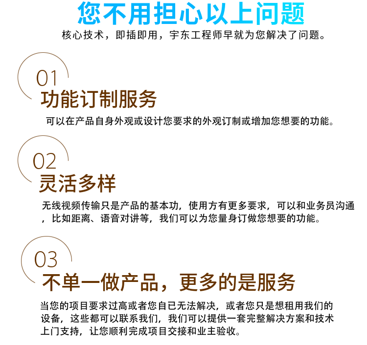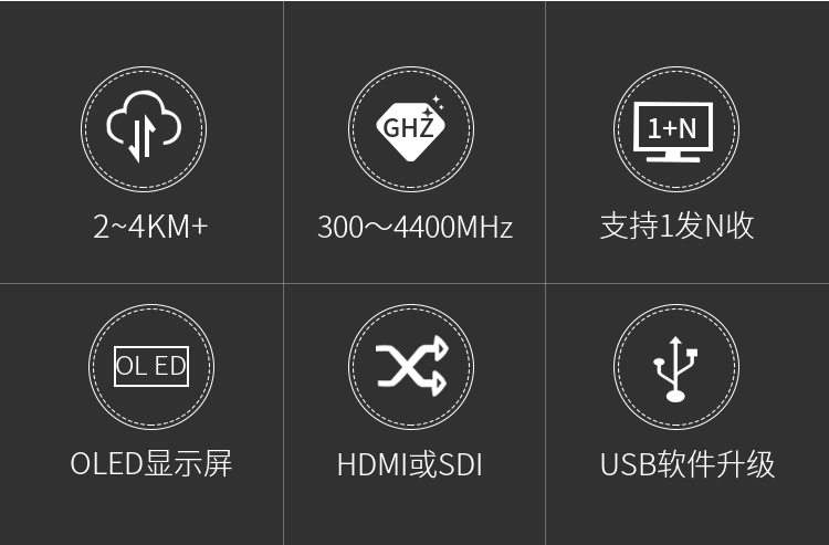 5. 宇東非視距調制技術,發射機輸入具備HDMI以及CVS復合視音頻接口,各種接口可現場自由切換。