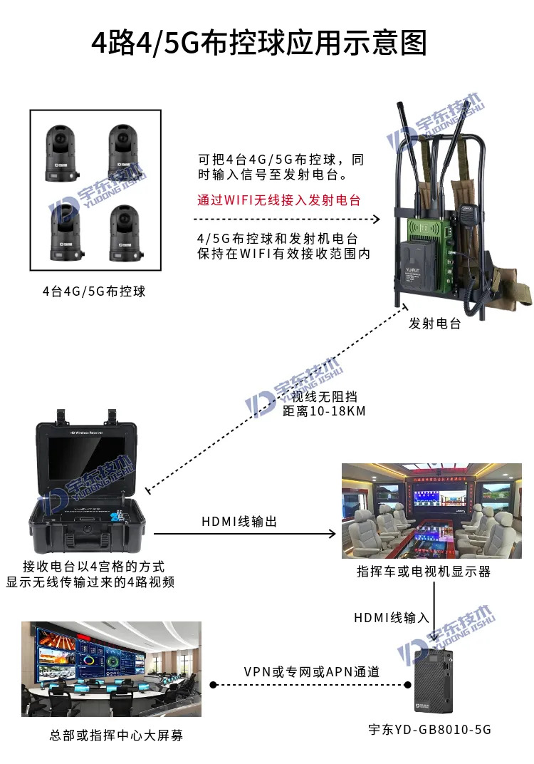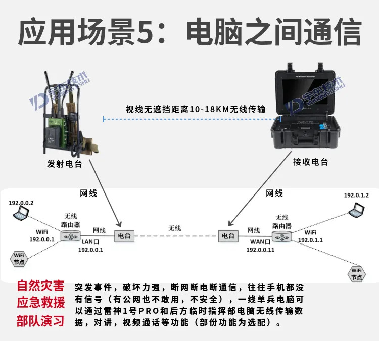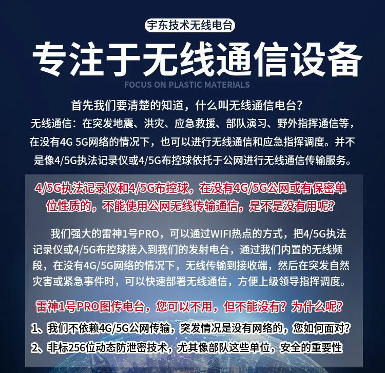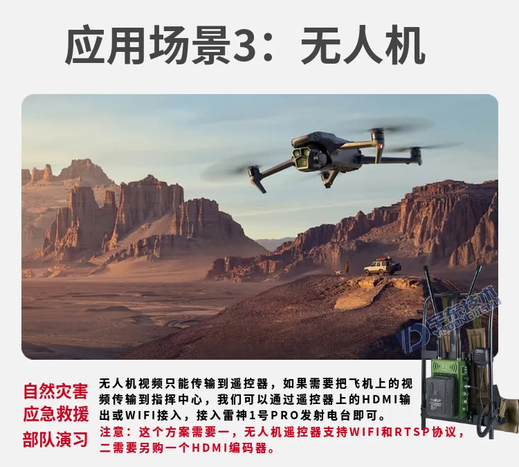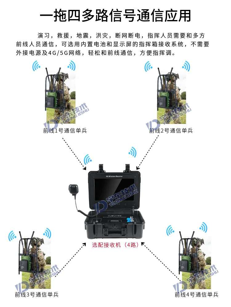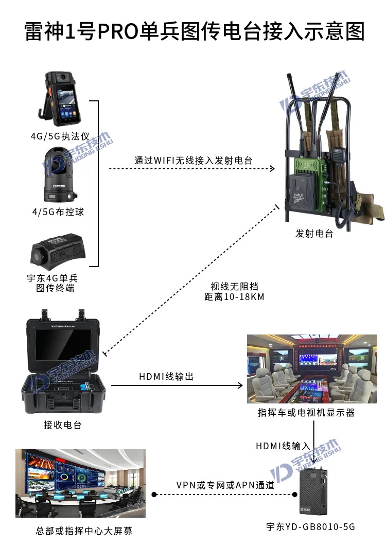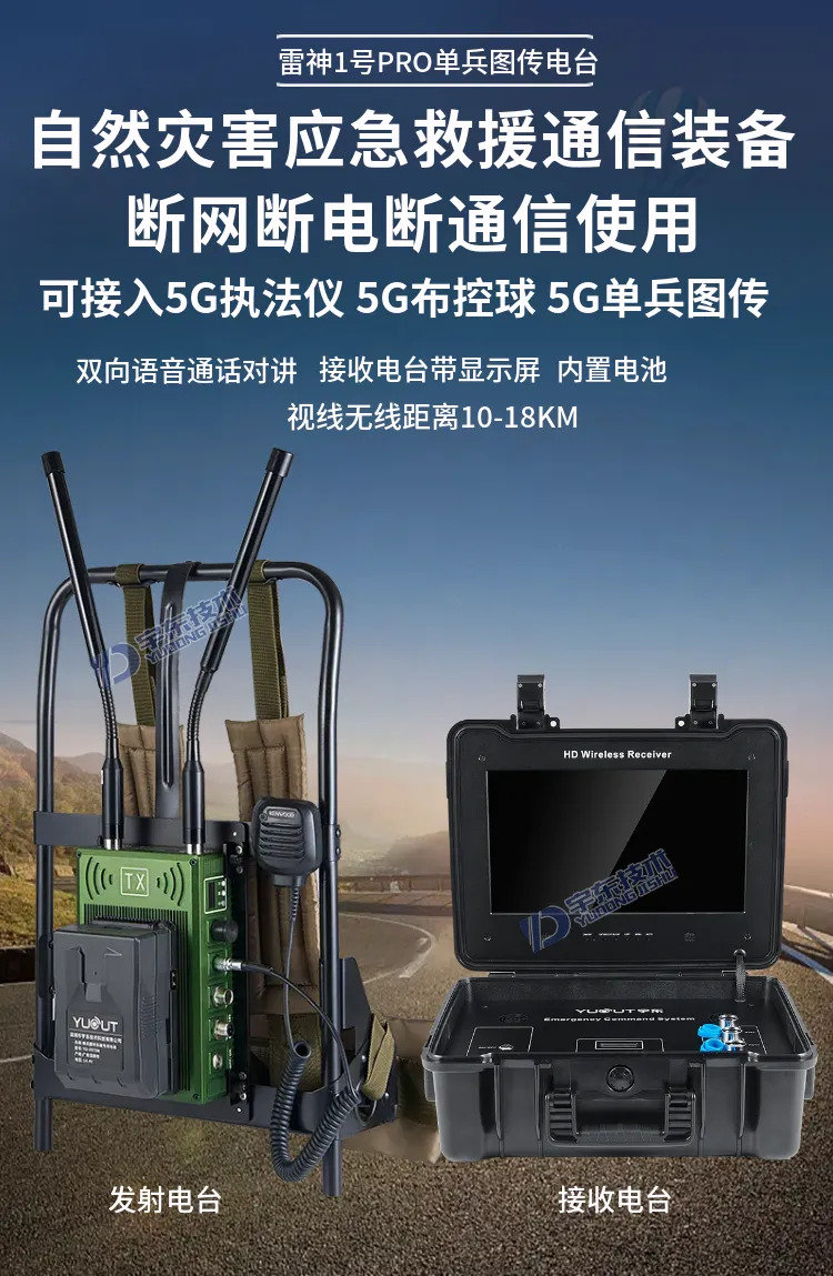 宇東技術雷神1號PRO背負式高清無線圖傳電臺,是公司針對應急救援指揮、公安、反恐作戰、消防救援、邊防執勤、海警海關巡檢、部隊拉練演習、森林消防等,在突發重大事件,斷網斷電,通信中斷的情況下,現場工作人員通過雷神1號PRO背負式高清無線圖傳電臺,把現場采集的數據實時無線傳輸到指揮車/臨時指揮部大屏幕,讓指揮部領導對現場情況一目了然,節省了到達現場的時間,可快速做緊急指揮調度,最大限度的減少突發事件帶來的各種損失,雷神2號plus單兵電臺支持雙向語音對講系統,現場工作人員可以和指揮部通話,接受領導發送的各種指令。