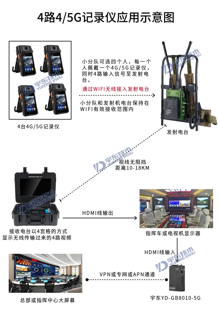 宇東技術雷神2號plus背負式高清無線圖傳電臺,就是把一線單兵的現場畫面實時的無線傳輸到指揮車/指揮部,并支持雙向語音對講,指揮員可以在指揮車/指揮部查看現場畫面,并可以和一線單兵人員對講通話,輕松完成指揮調度工作。